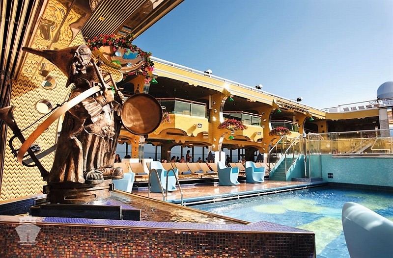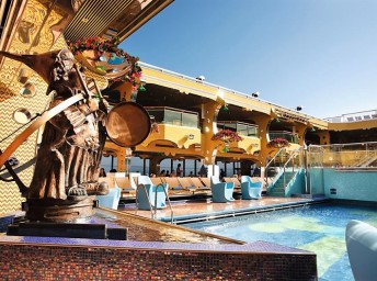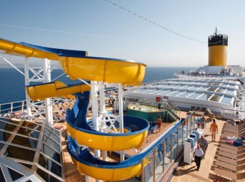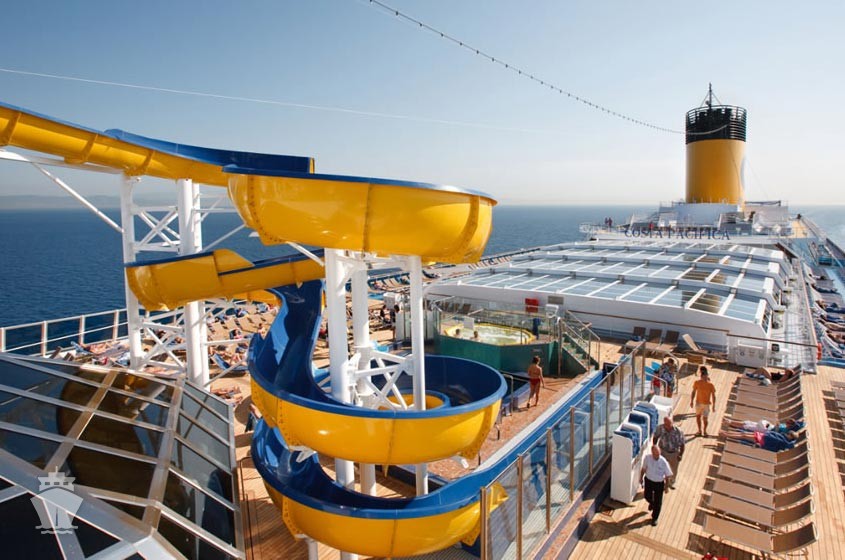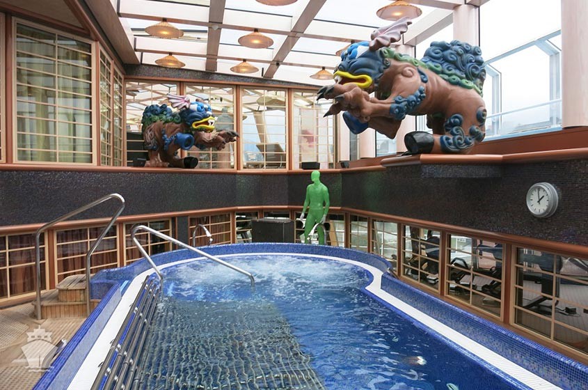 - otevřený bazén na horní palubě, 1 bazén s posuvnou prosklenou střechou, bazén pro děti s vodním miniparkem