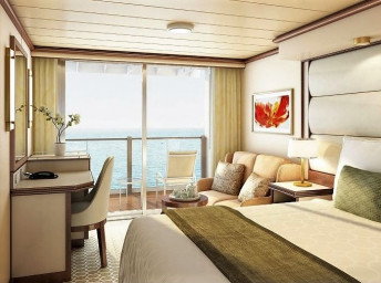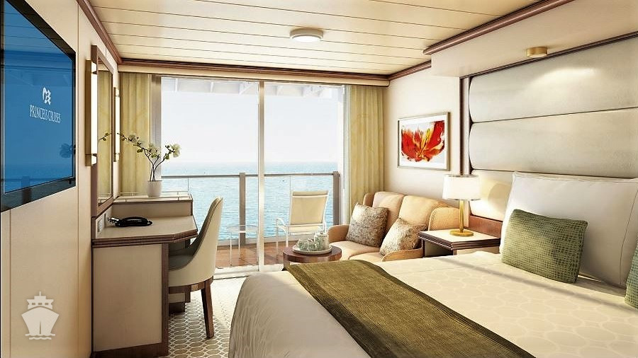 Standardní vybavení kajut: koupelna se sprchou a toaletou, 2 lůžka s možností konfigurace, úložné prostory, minibar, fén, TV, trezor. Balkony je vybaven malým stolkem a 2 židlemi či lehátky.