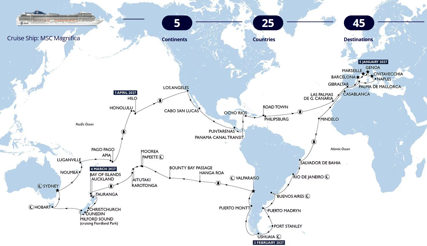 Přeměňte své cestovatelské sny ve skutečnost a vydejte se na úžasnou plavbu kolem světa: MSC World Cruise 2027, která je nyní v prodeji. Čeká vás neuvěřitelných 122 dní, během nichž navštívíte 5 kontinentů, 45 jedinečných destinací ve 32 zemích.