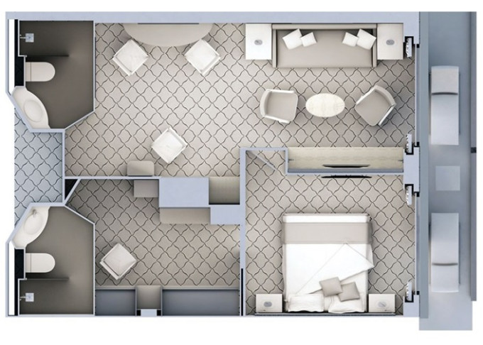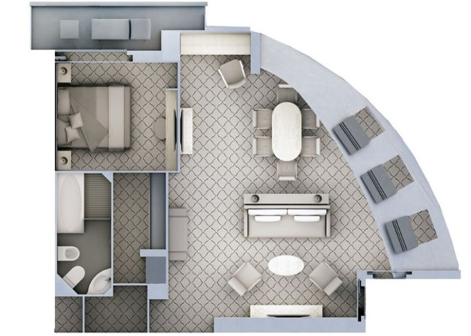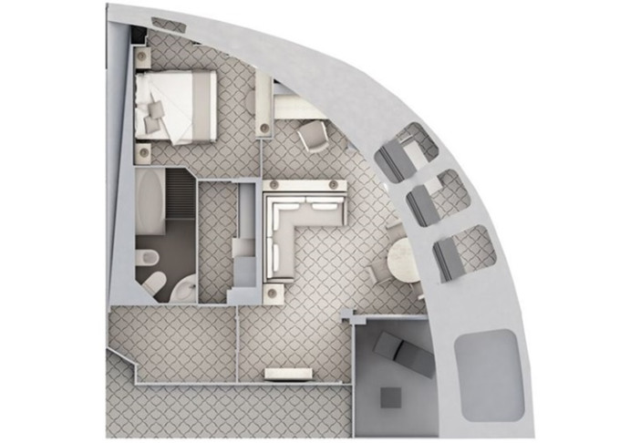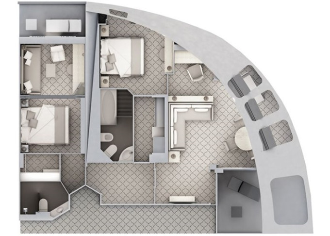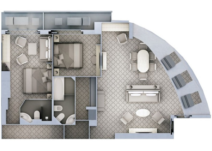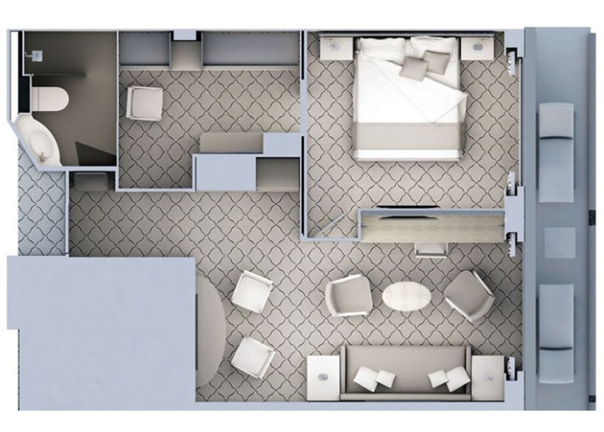 | R1 - Royal Suite 1 69 m² (včetně balkona), oddělená obývací časť a ložnice | 2 161 977 Kč 720 659 Kč za osobu | ||