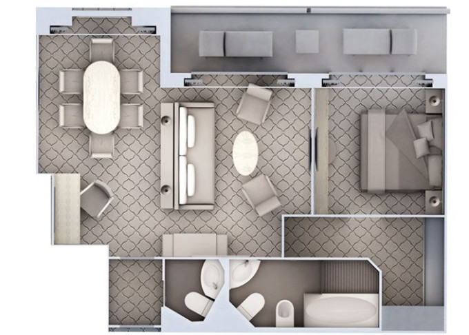 | R1 - Royal Suite 1 69 m² (včetně balkona), oddělená obývací časť a ložnice | 2 882 636 Kč 720 659 Kč za osobu | ||