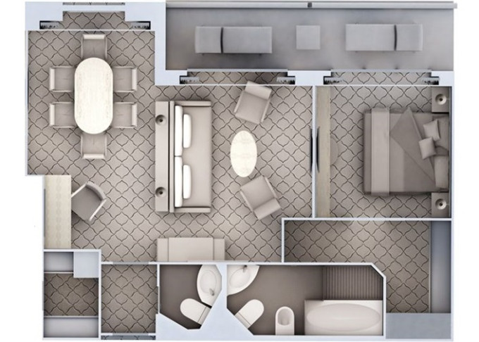 | R1 - Royal Suite 1 69 m² (včetně balkona). Obývacia časť s jedálňou, oddělená ložnice. | 1 989 917 Kč 994 958 Kč za osobu | ||