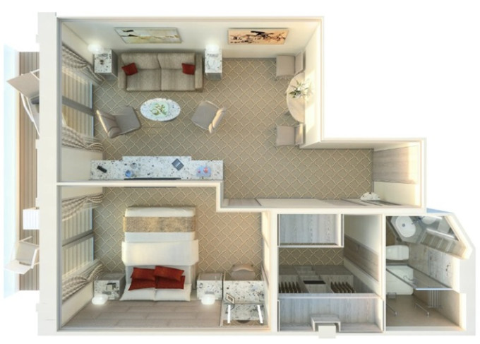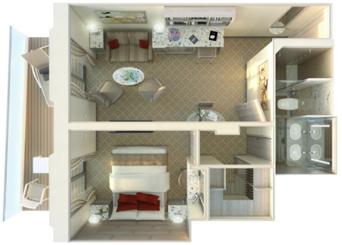 | R1 - Royal Suite 1 69 m² (včetně balkona). Obývacia časť s jedálňou, oddělená ložnice. | 1 989 917 Kč 1 989 917 Kč za osobu | ||