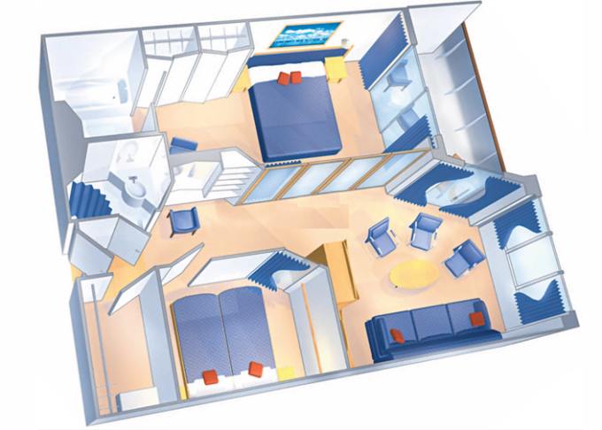 | VO - Ocean View Suite (bez balkonu) / 2 ložnice 44,5 m². Panoramatické neotevíratelné okna. Výhody Royal Suite Class. 8. paluba. Max 8 osob. | 148 920 Kč 37 230 Kč za osobu |