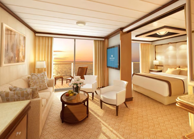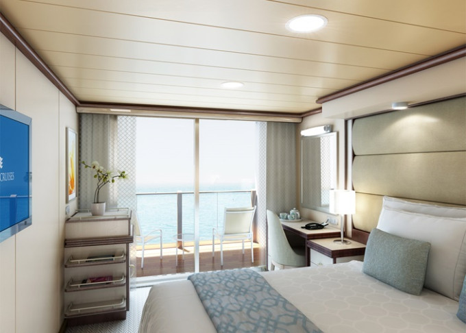 Standardní vybavení kajut: koupelna se sprchou a toaletou, 2 lůžka s možností konfigurace, úložné prostory, minibar, fén, TV, trezor. Balkony je vybaven malým stolkem a 2 židlemi či lehátky.