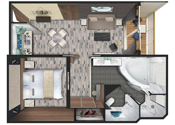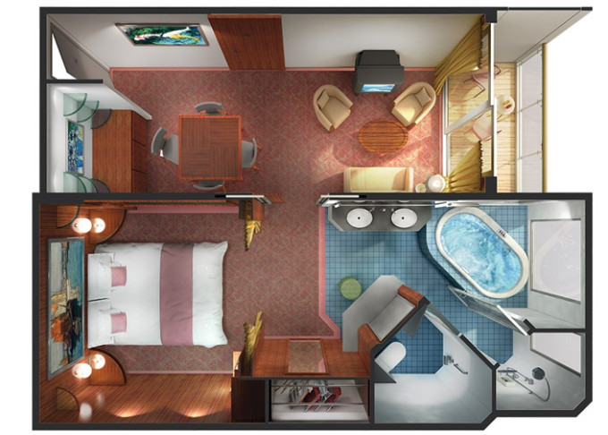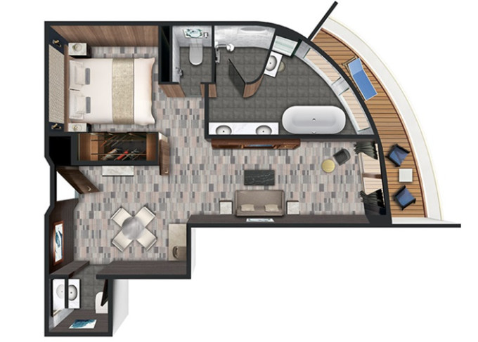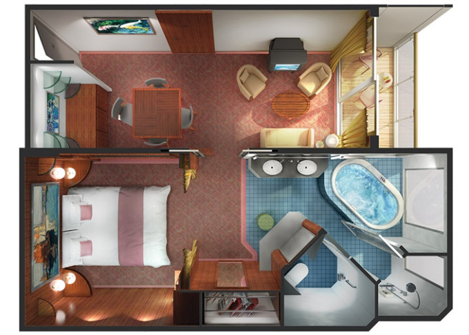 | SC - Forward-facing Deluxe Penthouse Suite 52 m² / balkon 11 m². Vířivka. Výhody Suite. 10. paluba - vpředu. Max 3 osoby. | 604 606 Kč 302 303 Kč za osobu |