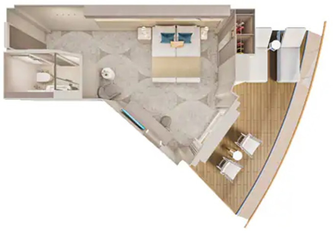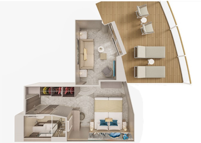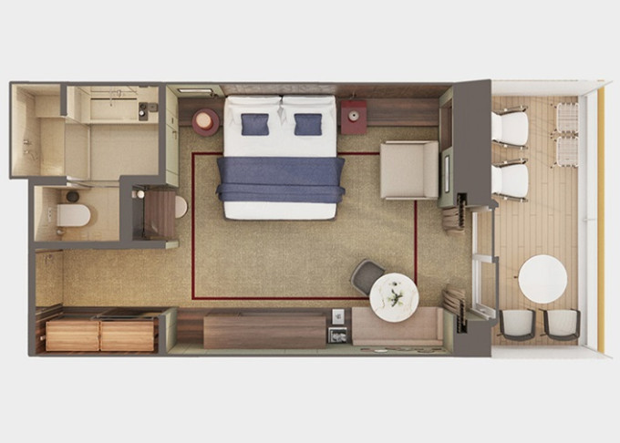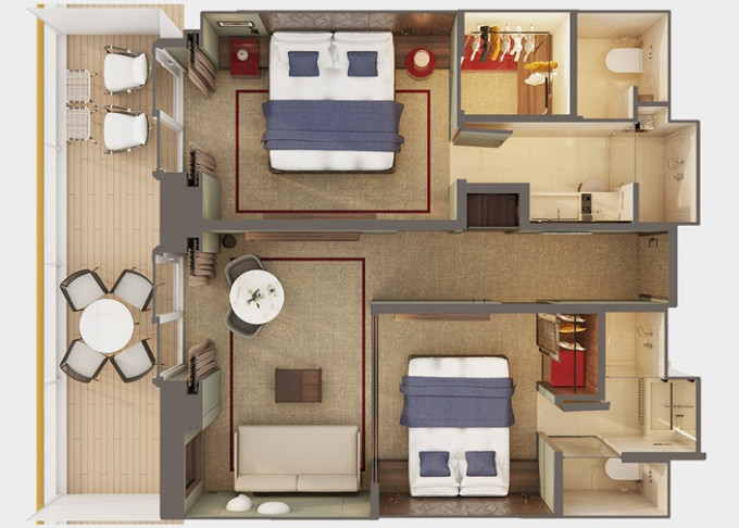 | SH - Suite s velkým balkónem Aft-Facing 59 m² / balkón 34 m². Výhody Suite. 9. paluba - vzadu. Max 4 osoby. | 163 333 Kč 81 666 Kč za osobu |