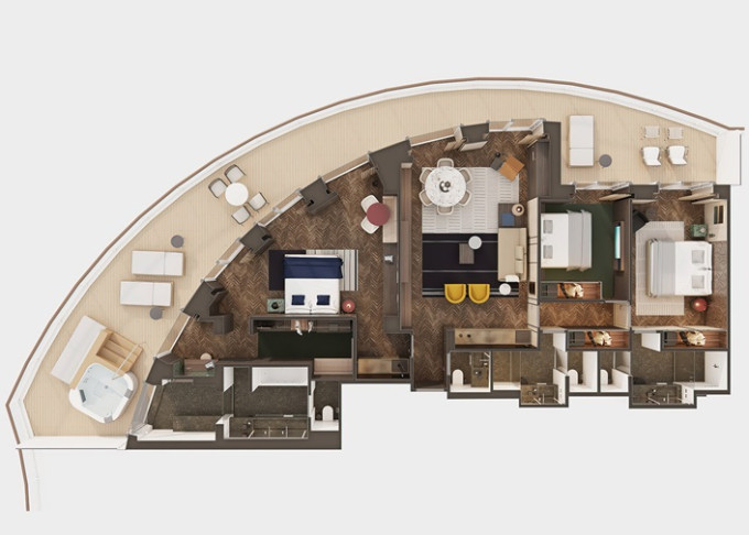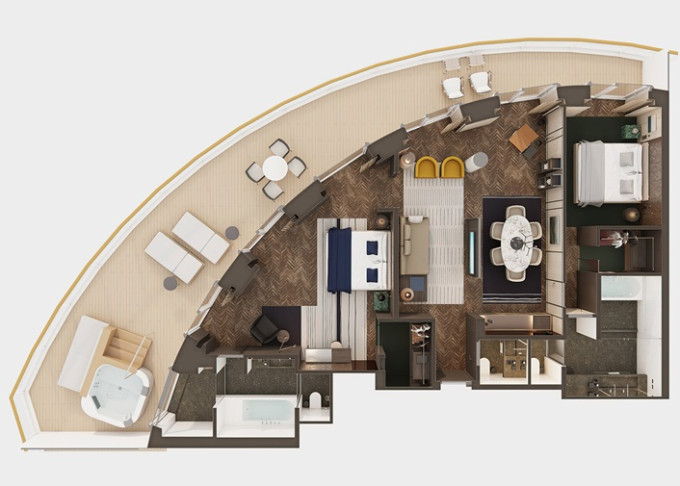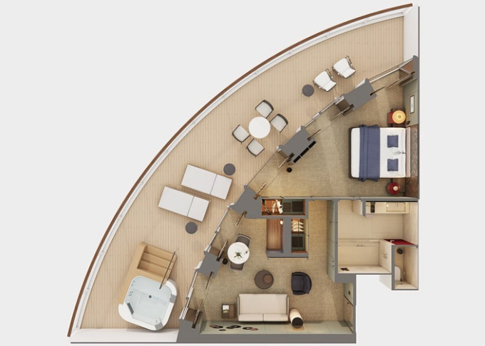 | H3 - Suite THE HAVEN DELUXE OWNER'S s balkónem 149-162 m² / balkón s vířivkou 57-68 m². Výhody The Haven. 13/15. paluba - vzadu. Max 6 osob. | 336 590 Kč 168 295 Kč za osobu |