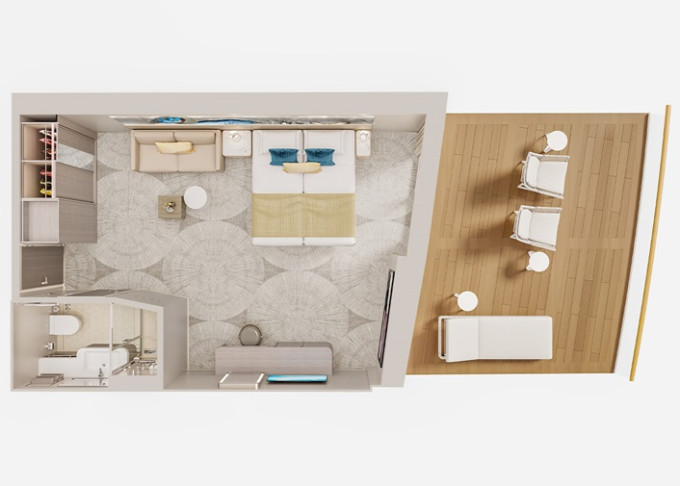 | SI - Suite s velkým balkónem Aft-Facing 42 m² / balkón 18 m². Výhody Suite. 9. paluba - vzadu. Max 2 osoby. | 159 143 Kč 79 572 Kč za osobu |