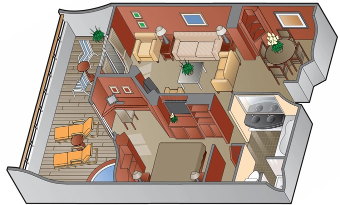 - kajuty umístěné v blízkosti Spa areálu s luxusním vybavením (exkluzivní ložní prádlo, posílená vzdušná filtrace, velkorysé úložné prostory aj.)