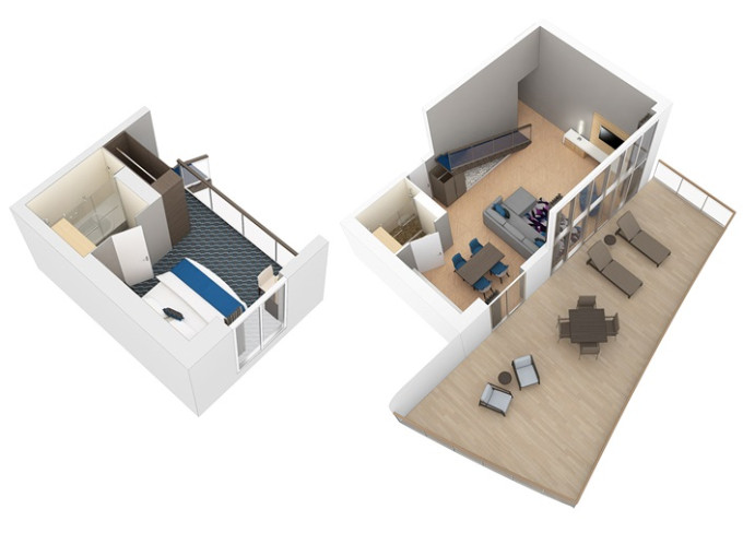 | L1 - Crown Loft Suite s balkonem 50 m² / balkon 10 m². 2-podlažní apartmán. Výhody Royal Suite Class. 17. paluba. Max 4 osoby. | 278 538 Kč 278 538 Kč za osobu | ||