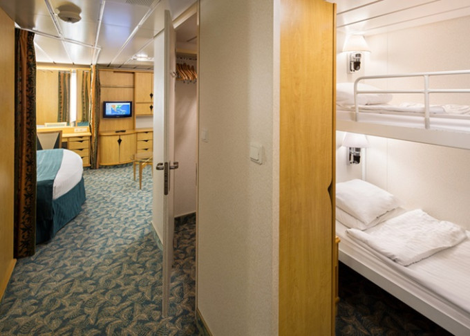 | 1Q - Velká vnitřní kajuta Promenade View 31,5 m². Velké neotevíratelné okna (výhled na Promenade). 7/8. paluba. Max 6 osob. | 86 679 Kč 21 670 Kč za osobu |