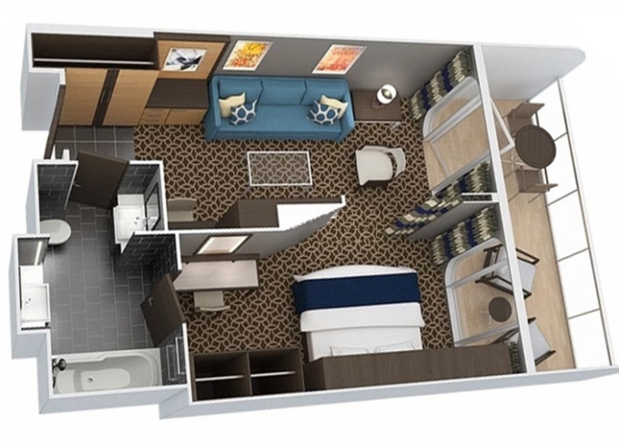 | 3U - Vnitřní kajuta s virtuálním balkonem 15 m². Obrazovka velkosti balkonových dverí s promítaným výhledem. 7. až 12. paluba. Max 2-4 osoby. | 166 574 Kč 41 644 Kč za osobu | ||