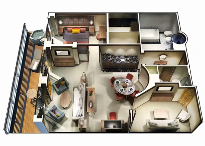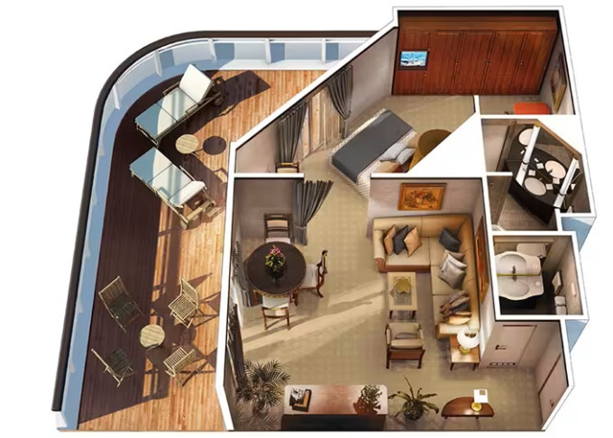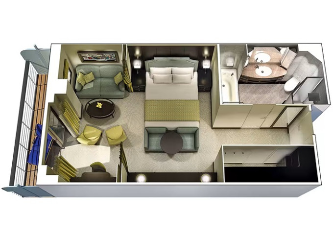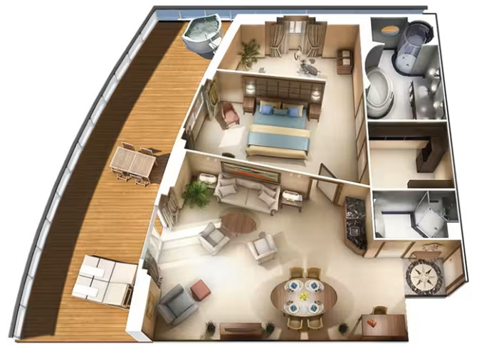 | OS - Owner’s Suite 123 m² + balkon s vířivkou od 62 m². Výhody Owners Suite. 8/9/10. paluba. Max 2-3 osoby. 4 izby: vstupná hala s pianom, ložnice, velká obývací místnost s jídelní částí, 2 koupelny (1 s vířivkou), 2 šatníky. | 1 287 661 Kč 643 830 Kč za osobu |