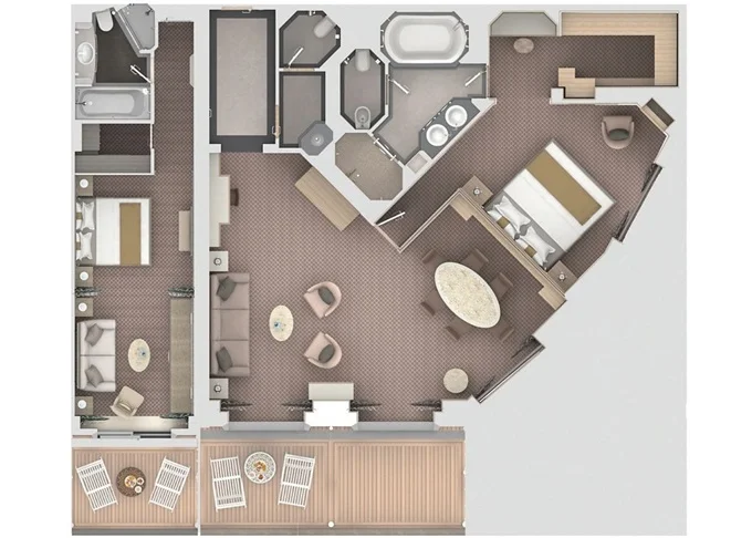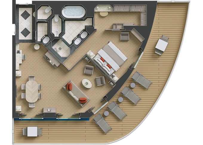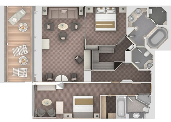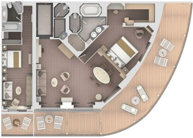 | R2 - Royal Suite 2 142 m² (včetně 2 balkonů). Royal Suite prepojená s Veranda Suite. | 1 117 146 Kč 558 573 Kč za osobu |