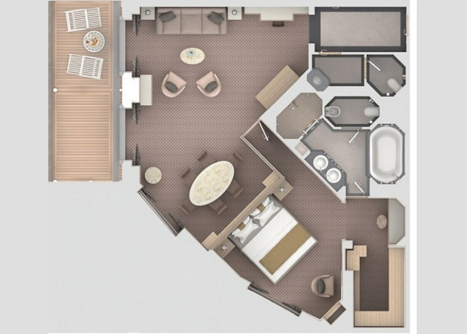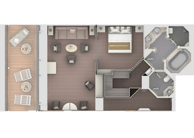| SV - Superior Veranda Suite 36 m² / balkon 6 m². Vyšší paluby. Ložnice s obývací částí. | 354 095 Kč 354 095 Kč za osobu | ||