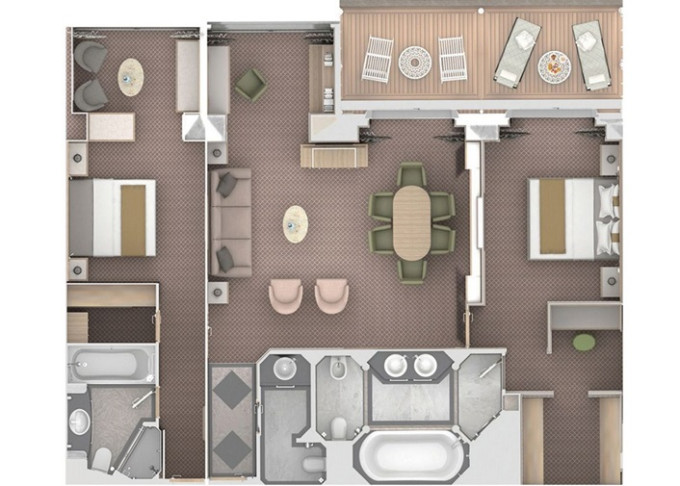 | S2 - Silver Suite 2 104 m² (včetně balkona). 2 ložnice, 2 koupelny, oddělená obývací časť. | 1 264 270 Kč 421 423 Kč za osobu |