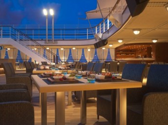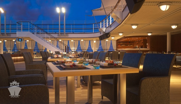 - La Terraza - ikonická Silversea à la carte restaurace. Výběr autentických italských receptur; mozzarella bar, sklep olivového oleje, bufet s mořskými plody a salumeria. Šéfkuchař Alberto Colombo. Dress code: neformální.