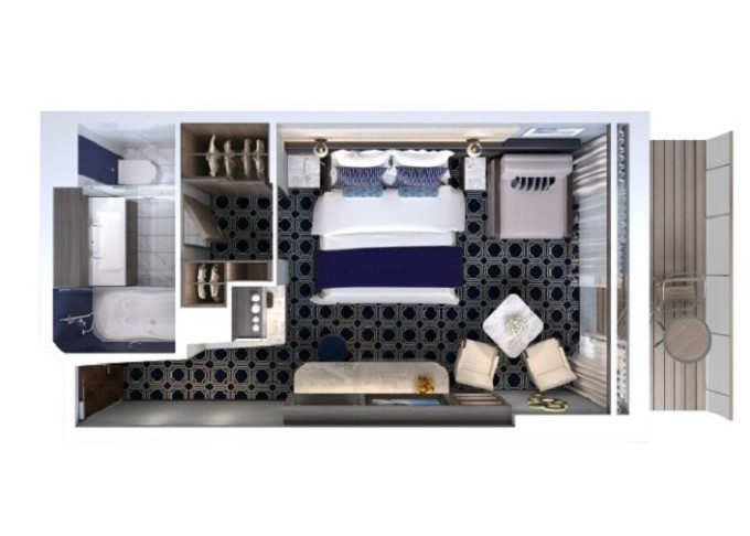 | B1 - Kajuta s balkonem Aft-facing od 20 m² / balkon od 4 m². 9. až 15. paluba - vzadu. Max 2-3 osoby. | 42 691 Kč 21 345 Kč za osobu |