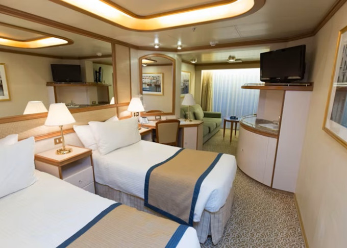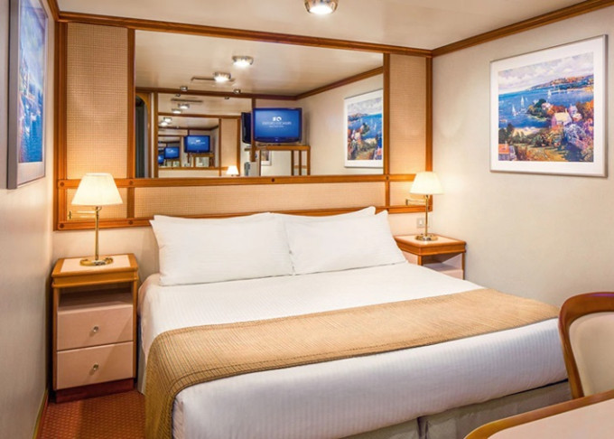 Standardní vybavení kajut: koupelna se sprchou a toaletou, 2 lůžka s možností konfigurace, úložné prostory, minibar, fén, TV.