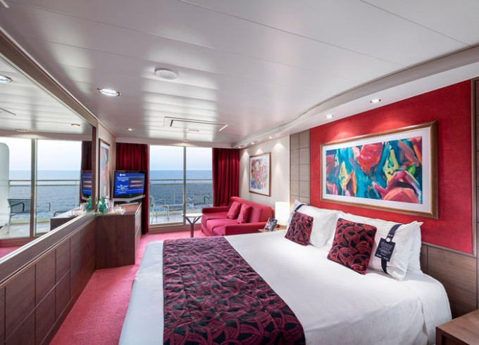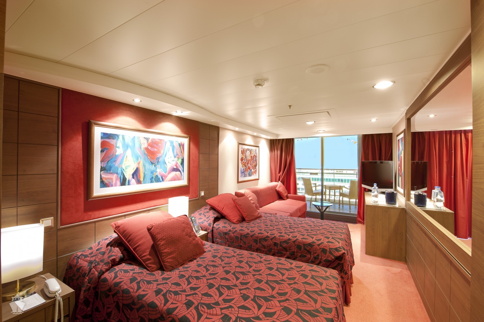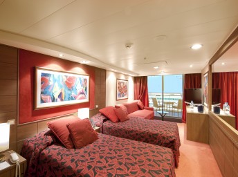 Suite s balkónem: cca 31 m², kajuta s manželskou postelí (na požádání 2 oddělené postele) a rozkládací pohovka. Klimatizace, koupelna s vanou a WC, toaletní stolek, prostorná skříň, interaktivní TV, telefon, minibar, sejf, vysoušeč vlasů. Balkon se stolkem a židlemi.