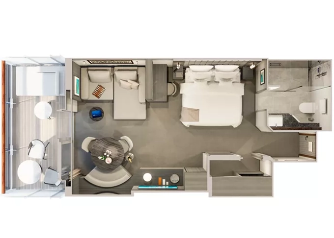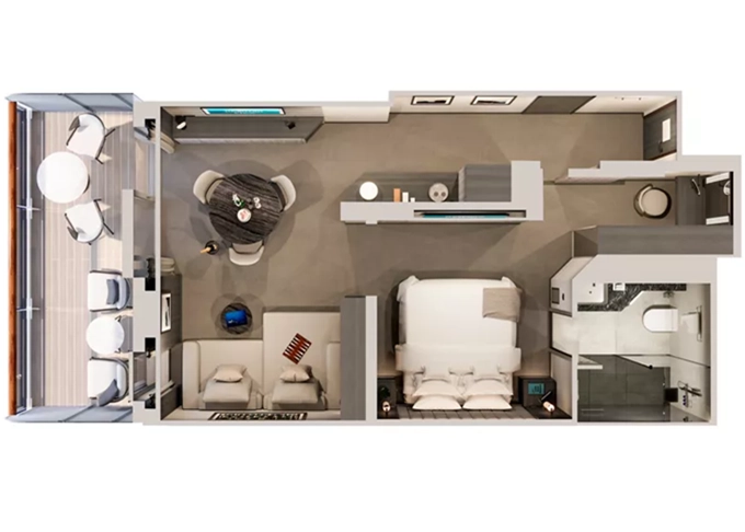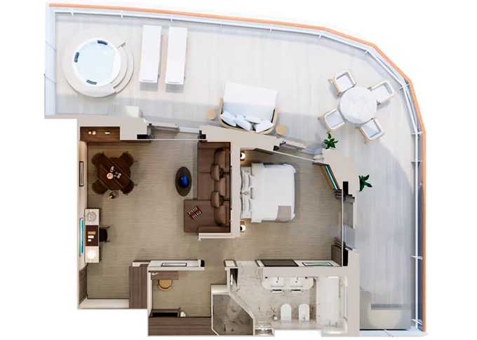 | Ocean Suites - Ocean Terrace Suite OT1 Suita 28 m² + terasa 7 m². 6. paluba střed / 7. paluba vepředu, vzadu. Maximální kapacita 2 dospělé osoby a 1 dítě do 17,99 let. | 171 063 Kč 85 532 Kč za osobu | ||