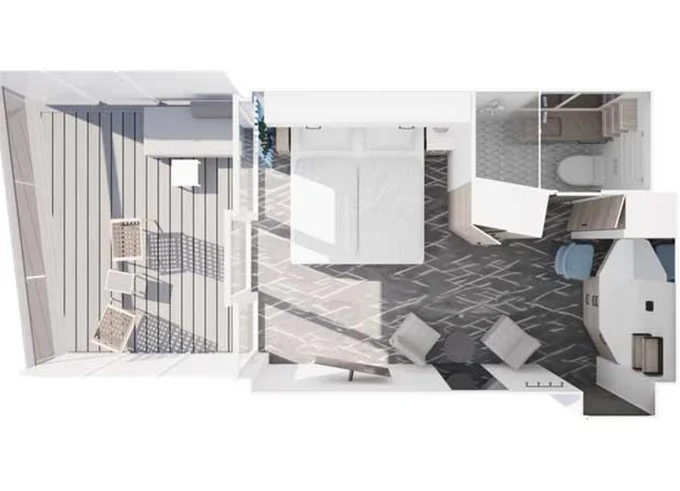| VEKO - Kajuta s terasou 20 m² + balkon 13 m² se židlemi a váľandou. 15. paluba. Max 2 osoby. | 84 335 Kč 84 335 Kč za osobu |